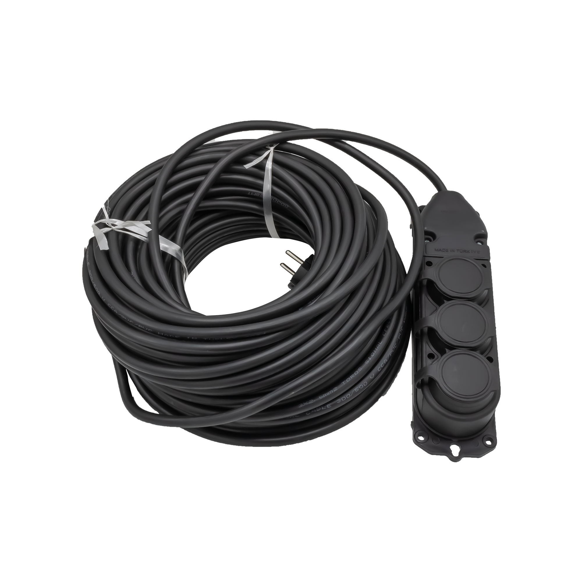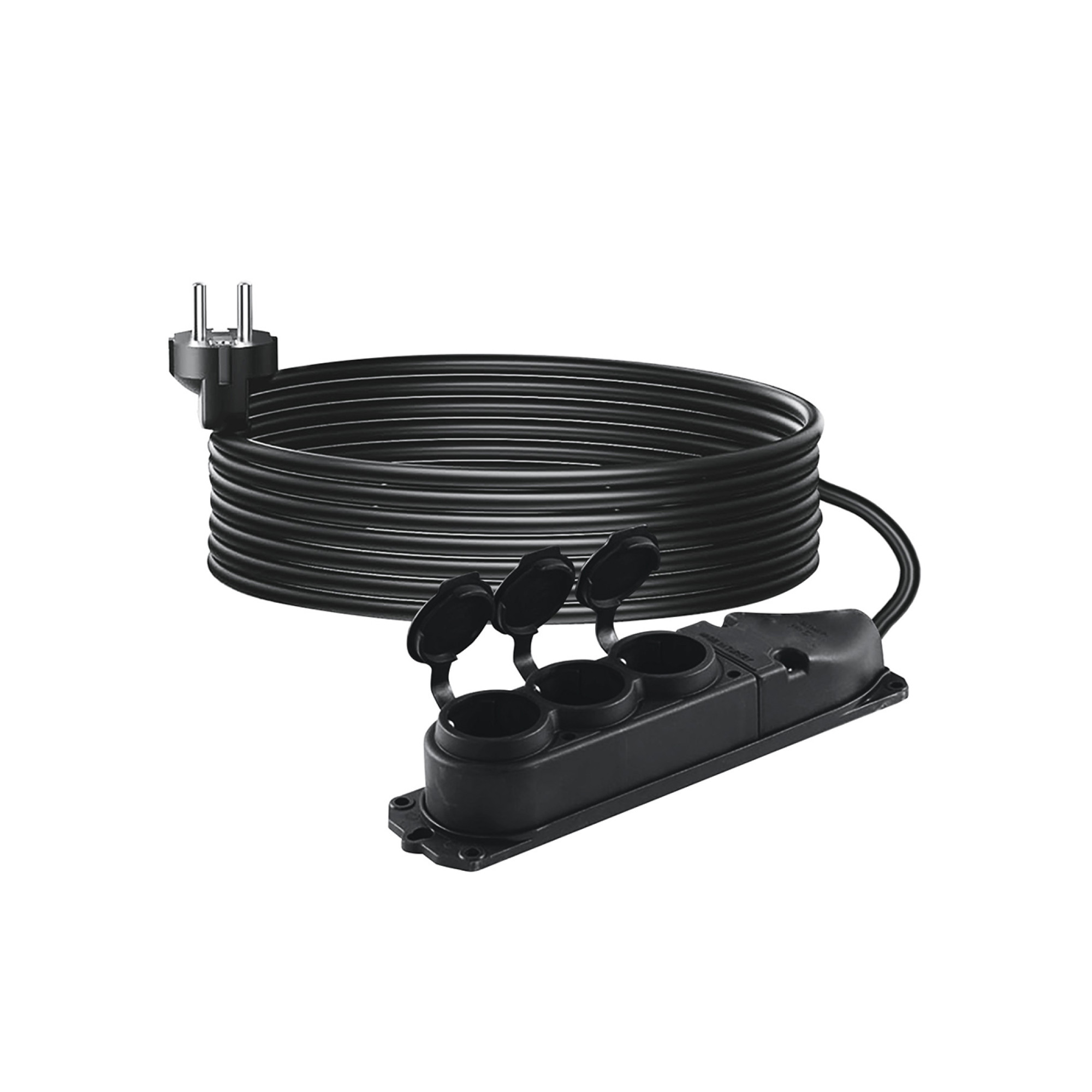 Prelungitor profesional din cauciuc de 30 metri, prevăzut cu 3 prize Schuko cu împământare și capace cauciucate IP44 pentru protecție împotriva prafului și umezelii.