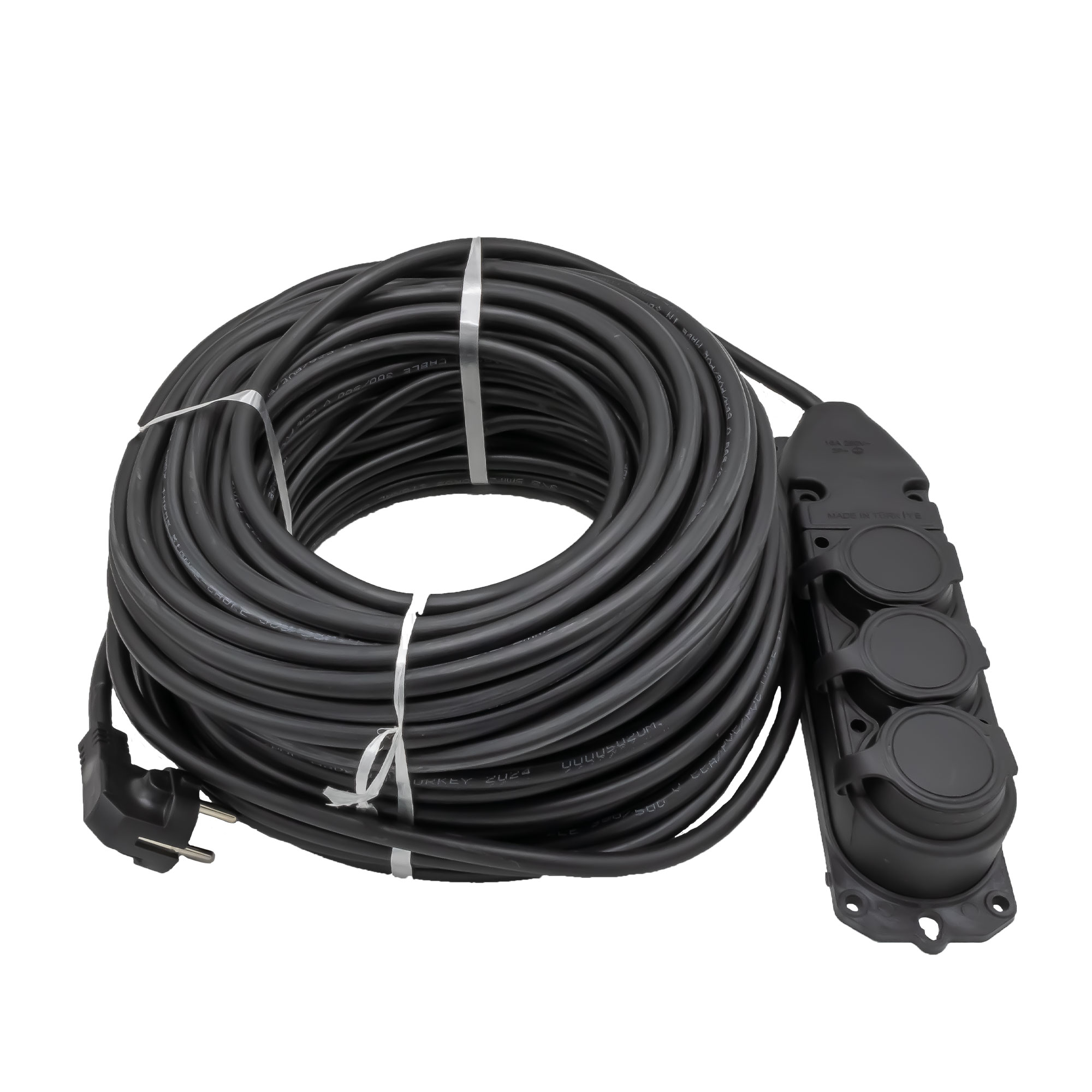 Prelungitor profesional din cauciuc de 40 metri, echipat cu 3 prize Schuko cu împământare și capace cauciucate de protecție IP44.