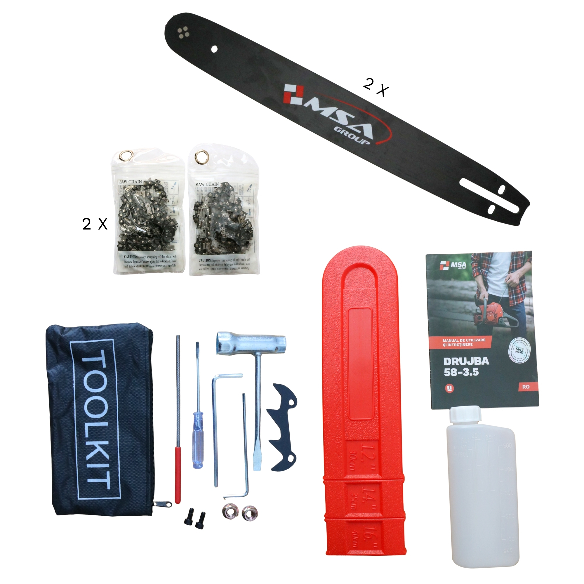 Pachetul include 2 lame și 2 lanțuri, oferind un avantaj major pentru utilizare continuă și schimb rapid în timpul lucrului.
