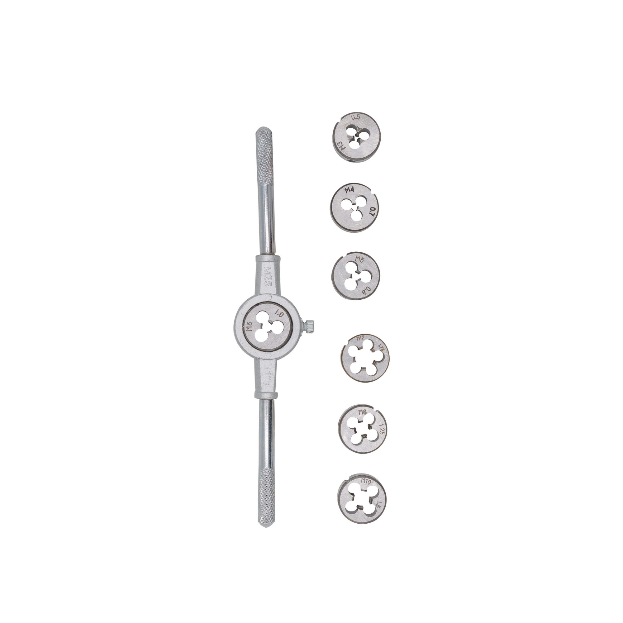 Set de filiere pentru realizarea și repararea filetelor exterioare pe șuruburi sau tije metalice. Setul conține filiere pentru dimensiuni de la M3 până la M12 și suport pentru filiere, fiind potrivit pentru lucrări de mecanică, atelier sau bricolaj.