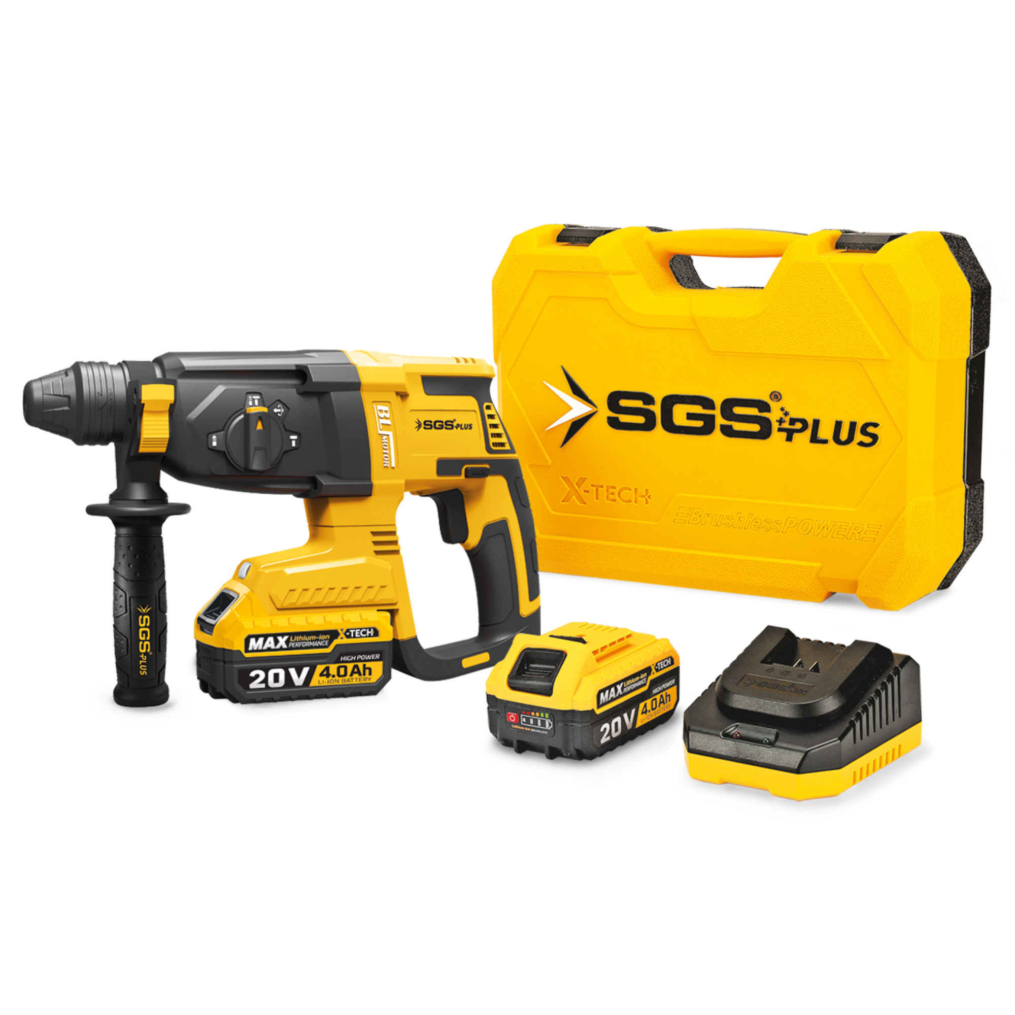Mașină de găurit cu percuție SDS Plus pe acumulator SGS PLUS 20V, motor brushless, 2.8J, 2×4.0Ah