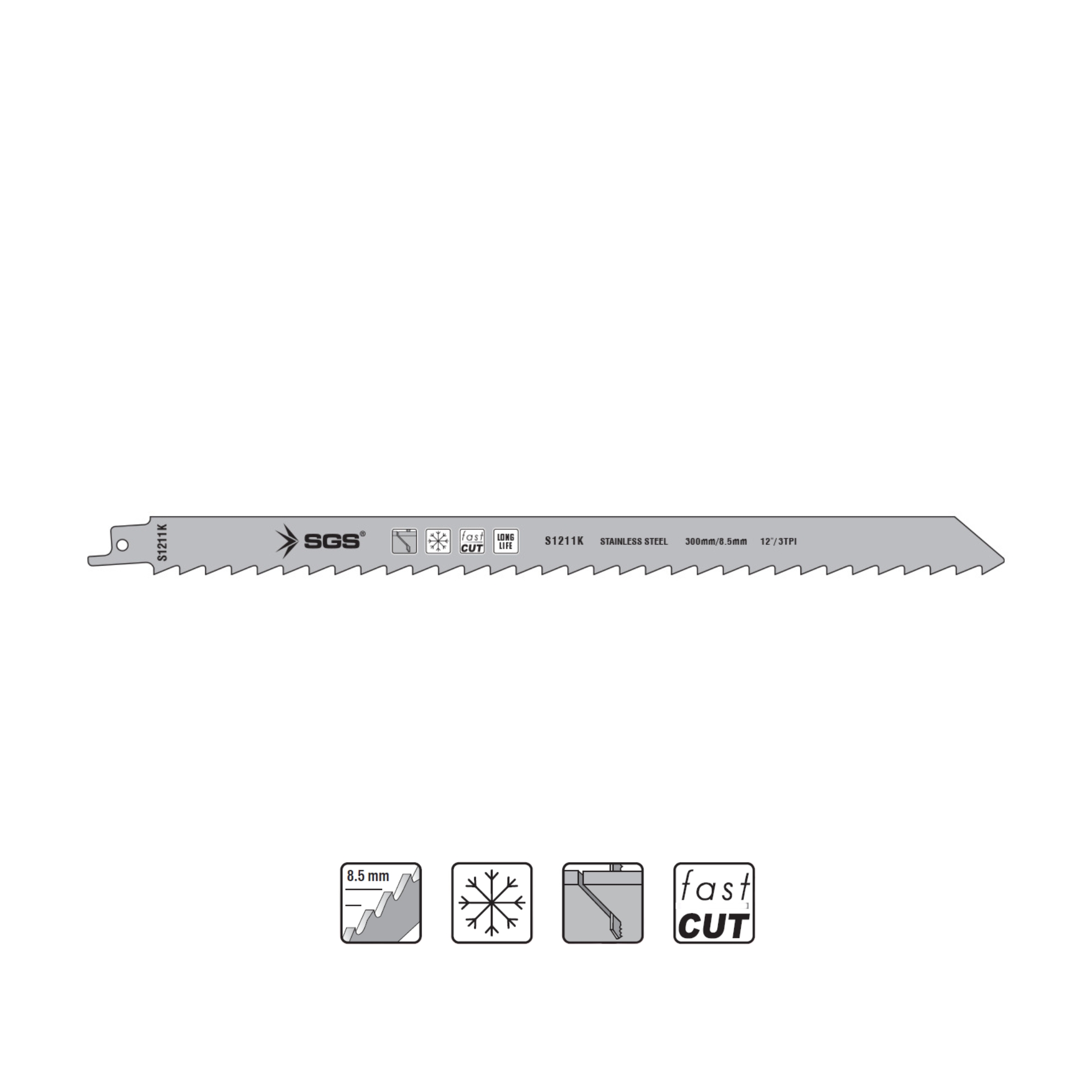• Set 5 pânze sabie S1211K inox 300×8.5 mm, 3TPI, pentru lemn, os, metal și PVC