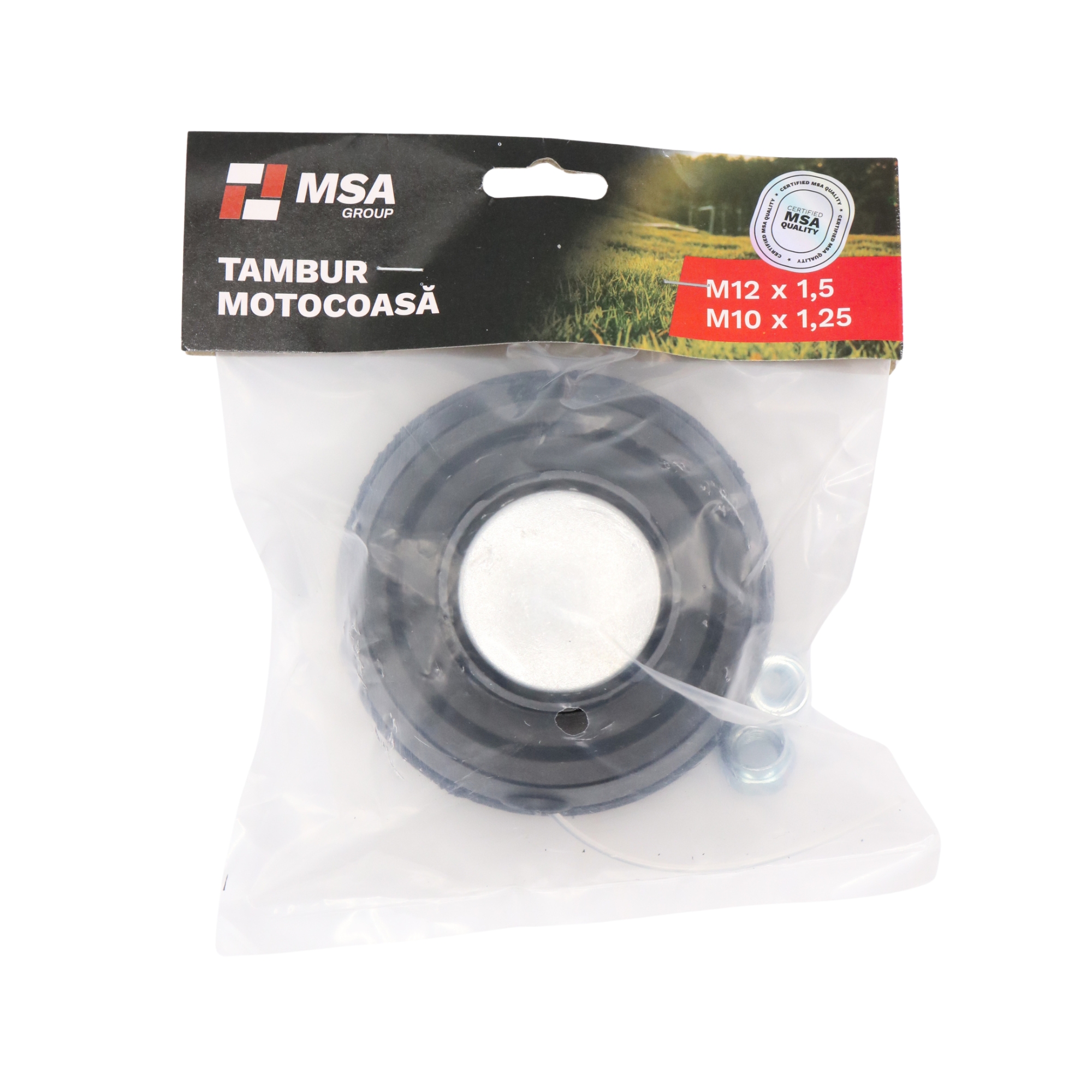 Tambur motocoasă negru cu metal + adaptoare M12 x 1.5 – M10 x 1.25, fir dublu, bump feed – MSA1511